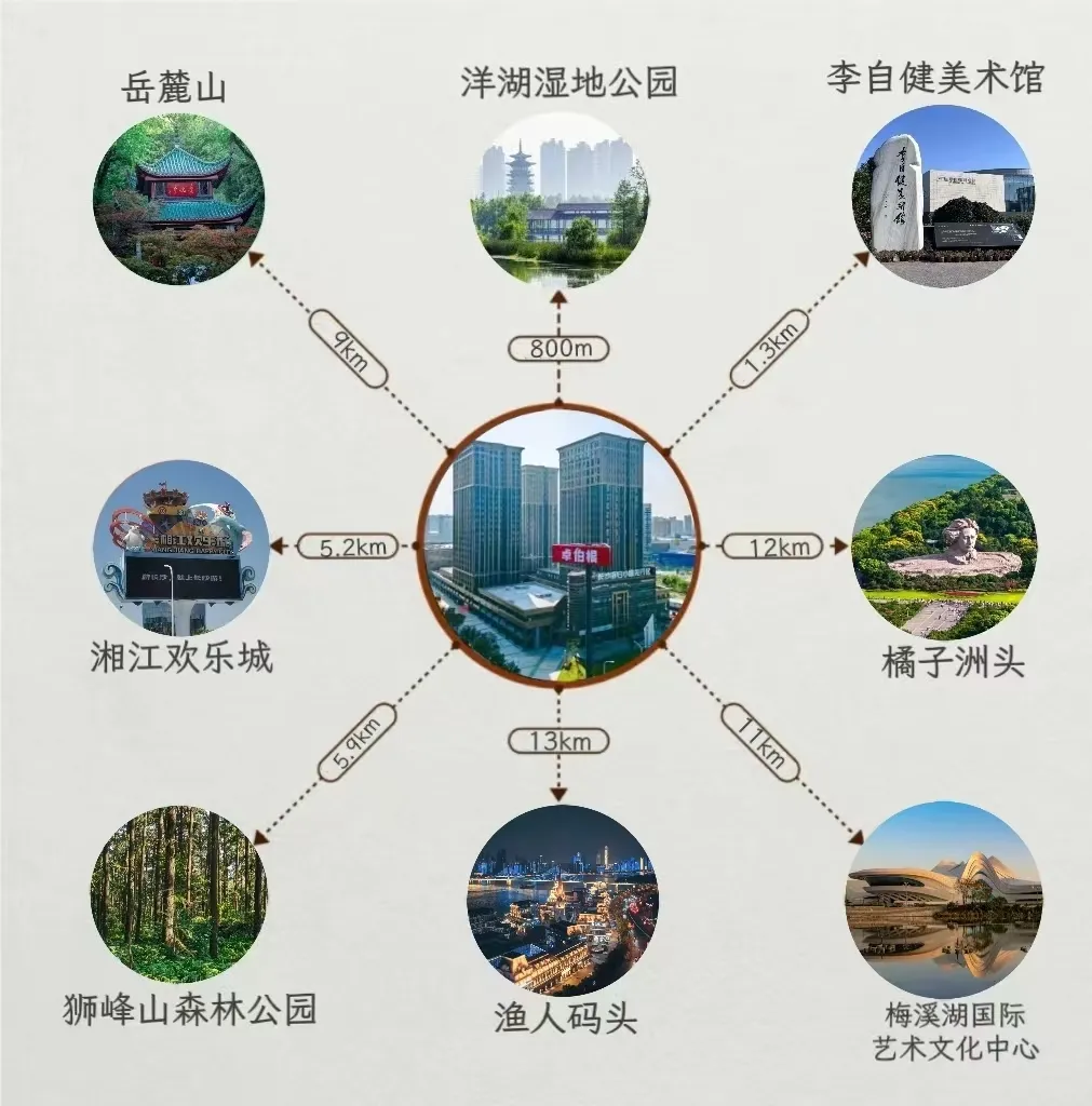 街区内有卓伯根国际游泳健身中心,长沙图书馆洋湖分馆,外国专家书屋,KTV,乒乓球馆,卓伯根1900夜市等生活所需配套。酒店地处地铁3号线,各主通道附近均有公交车站。